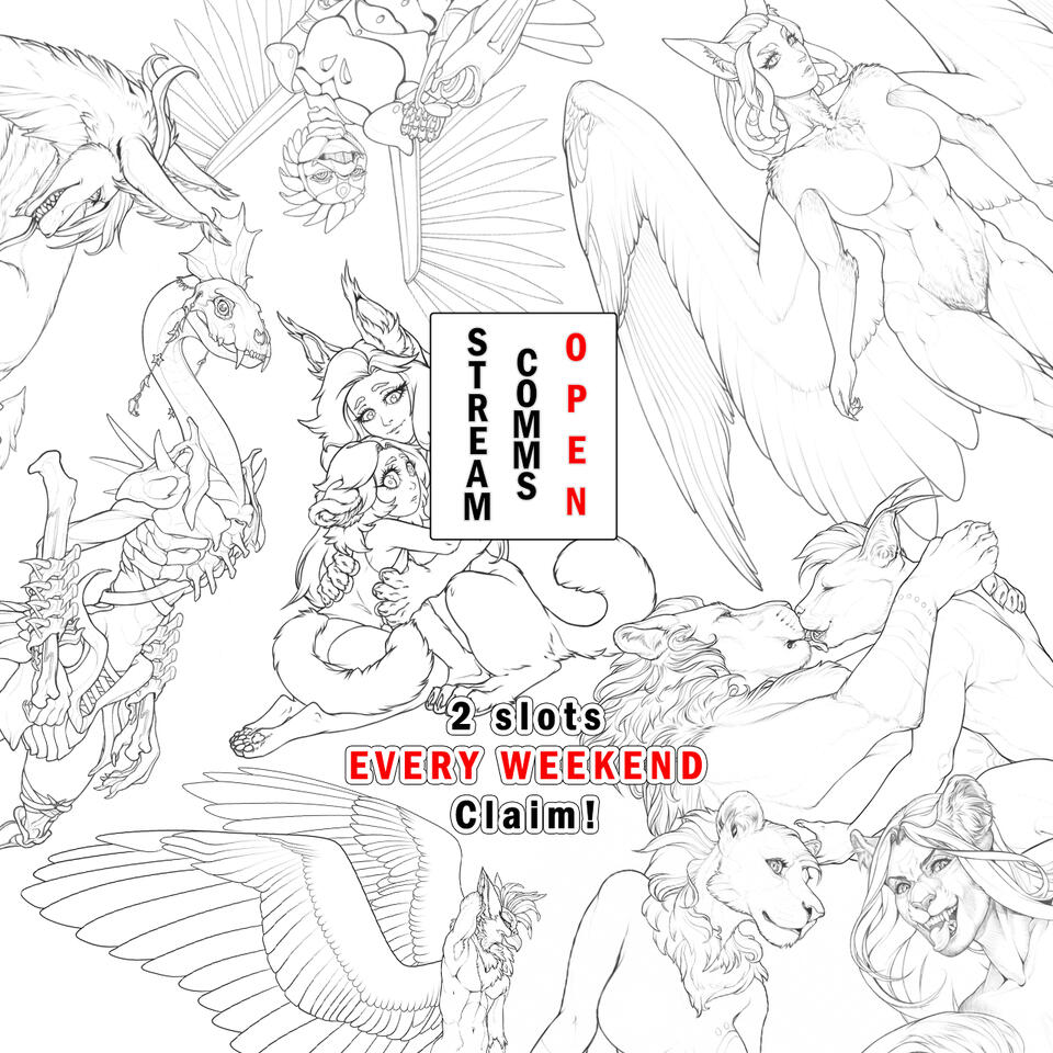 Custom (A.K.A.: "normal") commissions slots are opened within special announcement in the Discord or FA Journal.Stream commissions are painted on the working days or weekend by claimed slots.